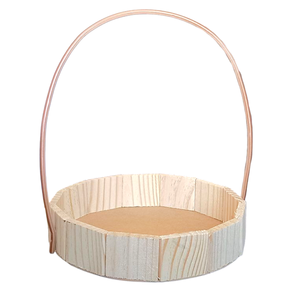 Cesta de Madeira feita com madeira pinus, fundo de MDF e alça de fio sintético.